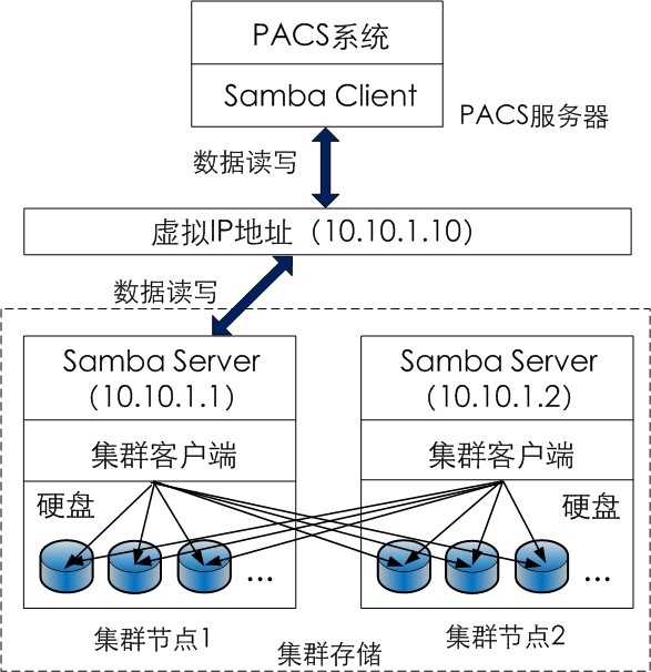 通过配置CTDB,把两个集群节点的物理IP隐藏于虚拟IP之后,PACS系统通过这个虚拟IP来访问集群存储,由CTDB把虚拟IP映射为其中一个集群节点的物理IP。如下图所示: